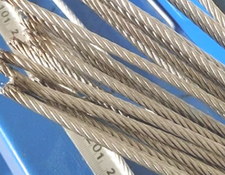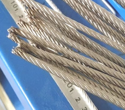 2、断丝分散出现在整条钢丝绳,任何一个捻距内单股的断丝数大于4根;或者断丝集中在钢丝绳某一部位或一股,一个捻距内断丝总数大于12根(对于股数为6的钢丝绳)或者大于16根(对于股数为8的钢丝绳)。